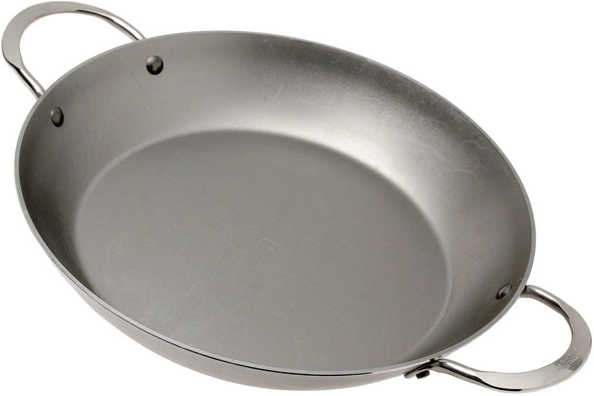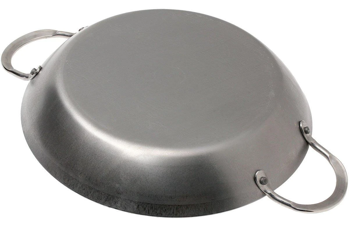This de Buyer Mineral B Element paella pan 32 cm 5652.32 is a special pan at a very reasonable price. With its two sturdy handles and low, wide shape, this pan is perfectly suited to making a delicious home-made paella. The pan is made of carbon steel. This type of steel is not stainless. That might seem like a drawback, but can work as an advantage through careful use. The pan is solid and heavy. It has no non-stick coating, but one will form automatically as you use the pan. As well as optimal heat conduction, the non-stick coating prevents the paella from sticking to the pan. Because the pan has no non-stick coating, it can withstand very high temperatures. Also, you can use steel cookware without worrying about damaging the non-stick coating. These Mineral B Element pans have a thin layer of beeswax on the cooking surface upon delivery. This significantly reduces the chance of corrosion upon delivery. It also helps to flavour the seasoning of the pan, and makes the pan slightly more non-stick than the regular Acier Carbone series, right from the start. It is suitable for all heat sources, including induction and oven use. Do keep in mind that the handle of this pan gets hot! Only wash this pan with hot water and a brush. Soap is out of the question, and a dishwasher will do irreparable damage to the pan. These pans require special treatment, but when used correctly, they are a pleasure to work with.