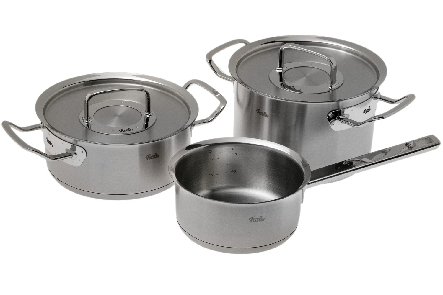 This Fissler Original Profi Collection pan set is comprised of three parts: a cooking pot, a casserole and a sauce pan. The cooking pot and the casserole are enhanced with a lid. Contents of this set: