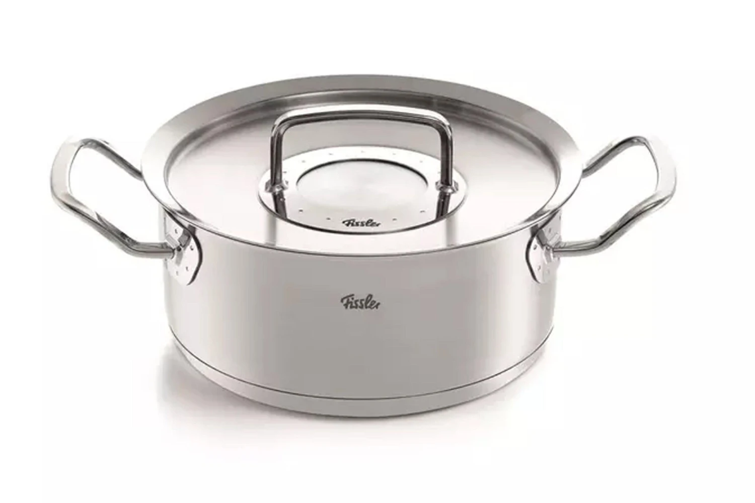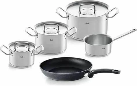This 5-piece Fissler Original Profi Collection pan set is comprised of three cooking pots, 1 sauce pan and 1 frying pan. The cooking pots all come with a lid. This set comes with an additional Fissler Adamant Classic Frying pan. Contents of this set: