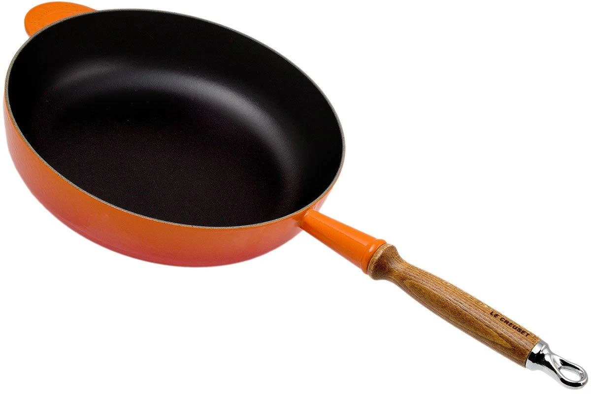 This Le Creuset sauté pan from the Fonte enamel collection is made from solid cast iron. It is a robust, top-quality pan that will last for generations. There are so many things you can do with this cast iron pan. You can cook, fry, grill and stew on all kinds of cooking hobs. The wooden handle is comfortable because it stays cool during use. However, the wooden handle means that the pan cannot be used in the oven. The pan is great for keeping dishes cool in the fridge or freezer, though. You could also use it as a serving dish for chilled food on a hot summer’s day.